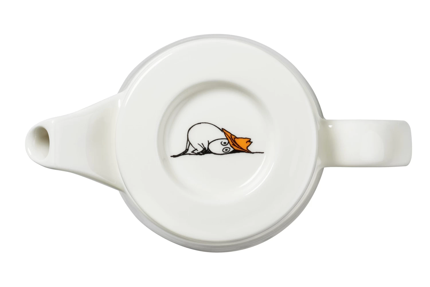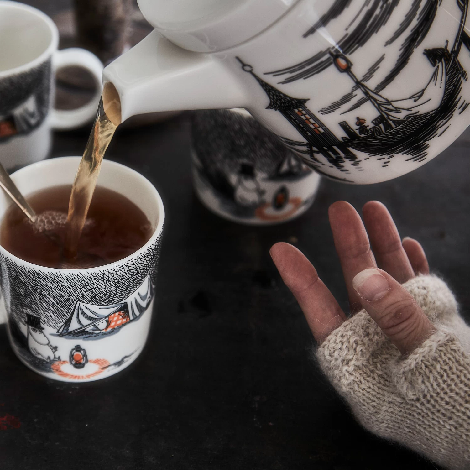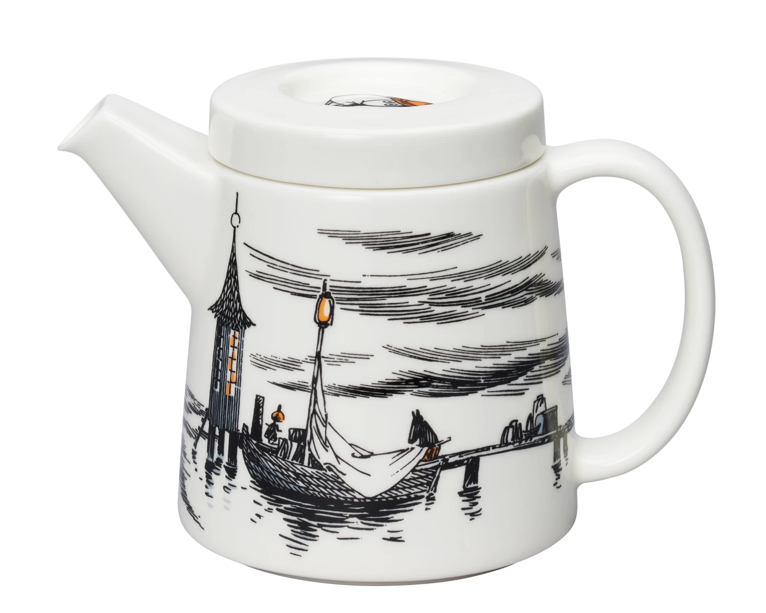 Das schwarzweiße Motiv der Teekanne wurde von Tove Slotte entworfen und basiert auf zwei von Tove Janssons Büchern. In dem ersten Buch hat die Mumin Familie eines Herbstes beschlossen, in einen Leuchtturm auf einer Insel zu ziehen. Das Meer ist unvorhersehbar und jeder erlebt die neue Umgebung auf unterschiedliche Weise. Das zweite Buch schrieb Tove Jansson kurz nachdem sie ihre Mutter verloren hatte. Das Buch enthält keine Mumin Trolle, sondern handelt von anderen Bewohnern des Mumintals, die sich nach der Rückkehr des Mumintrolls sehnen und alle unterschiedliche Gründe haben, das Mumin Haus zu besuchen. Auf diese Weise spiegelt die Geschichte Tove Janssons eigene Gefühle von Verlust, Traurigkeit und Sehnsucht wider und wie sie sich in dieser Zeit innerlich entwickelt hat.
