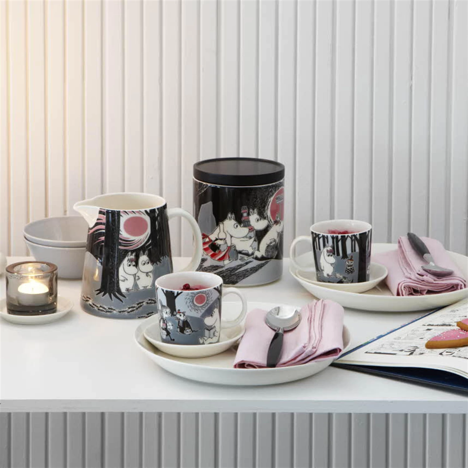Die neue Mumin-Tasse aus der ”Adventure”-Kollektion (Abenteuer) erzählt von einem Kometen, der das Mumintal bedroht. Alle Bewohner aus dem Mumintal machen sich auf den Weg in eine schützende Höhle, können dann aber aufatmen, weil schützende Naturkräfte den gefährlichen Kometen vertreiben.