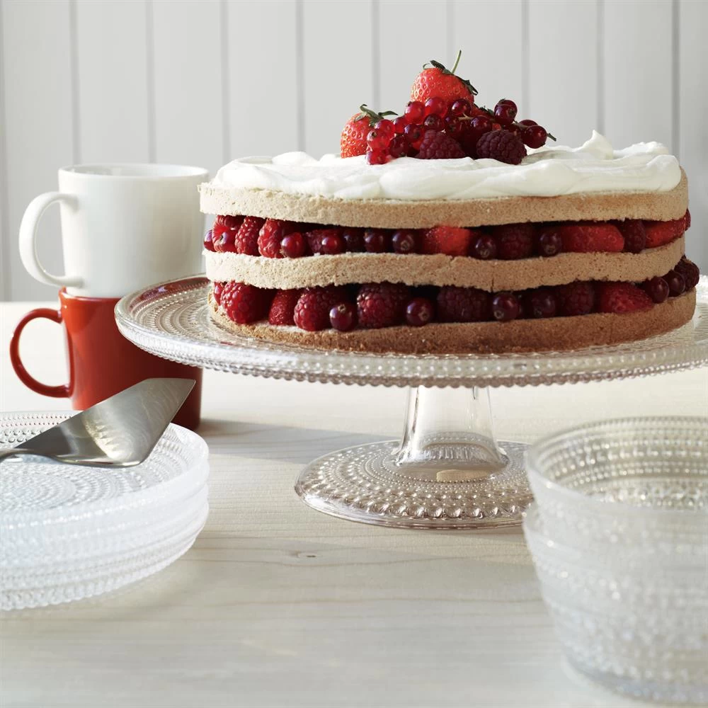 Dieser exklusive Tortenständer des finnischen Glasunternehmens Iittala ist Teil der Kastehelmi-Kollektion, die auf den Designer Oiva Toikka zurückgeht. 2010 hat Iittala Teile dieser legendären Glaskollektion aus den 1960er Jahren neu präsentiert – aus gutem Grund, denn auch fast 50 Jahre nach Erstpräsentation ist dieser Tortenständer in Skandinavien immer noch sehr beliebt.