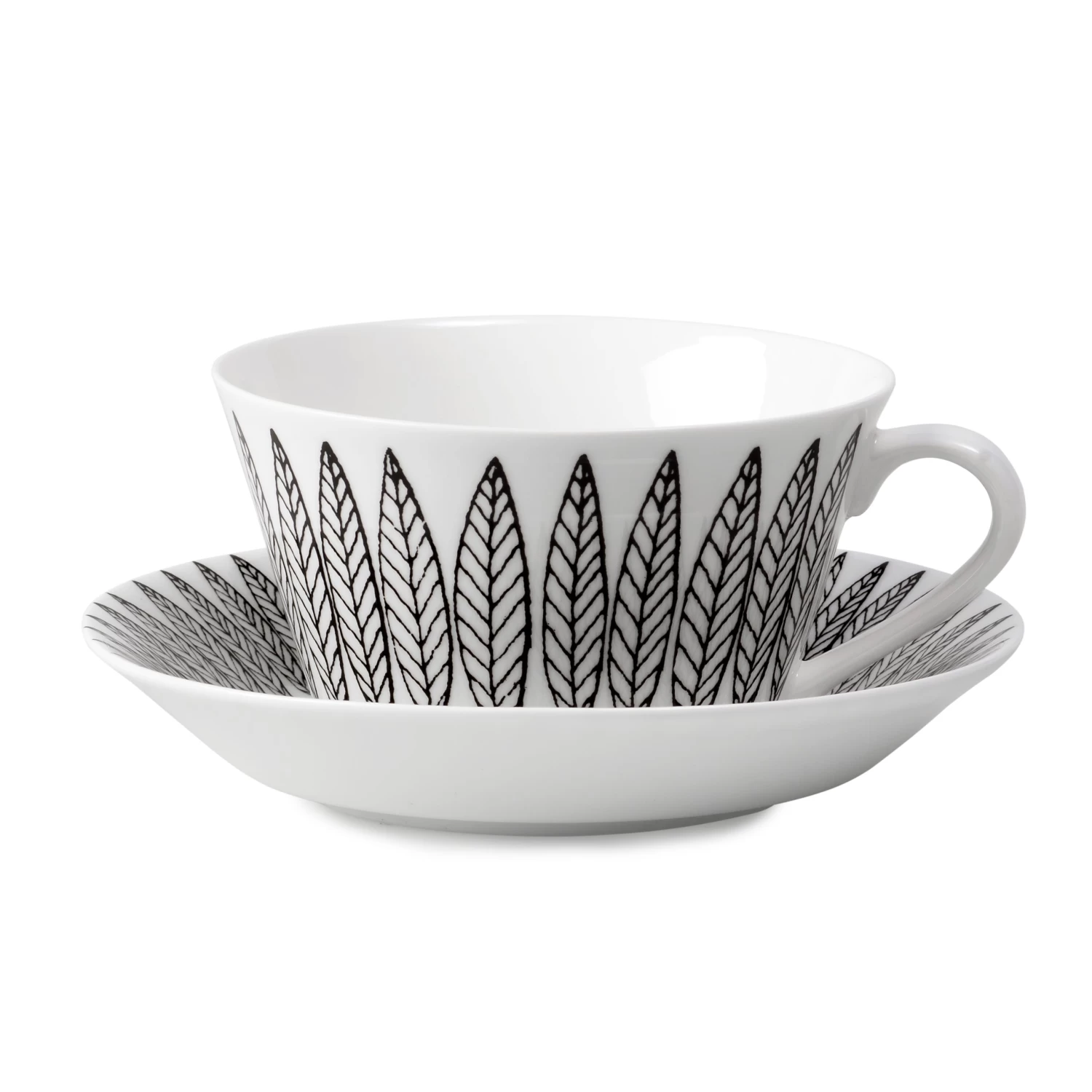 Genießen Sie einen wärmenden Tee aus der wunderbaren Svart Salix Tee-Tasse aus der aus der Gustavsberg Porzellanfabrik. Das von Stig Lindberg entworfene Tee-Set besteht aus einer Tasse mit dazugehöriger Untertasse. Beide sind aus exklusivem Knochen-Porzellan aus China und mit transparenter Glasur überzogen. Das Dekor sind die typischen schwarzen Pfeile der Serie. Die Salix-Reihe wurde 1954 zum ersten Mal auf den Markt gebracht und 2008 wieder in die Produktion aufgenommen. Der Name Salix ist abgeleitet vom lateinischen Wort für „Weide“, und das Muster bringt einen Hauch von Nostalgie zurück in die Teestunde und auf Ihren Tisch!